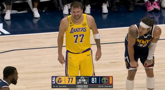 第二节湖人一直落后,而且在上半场最后34秒被掘金打出8-0攻势,半场打完湖人57-71落后14分,这一节东契奇8投2中拿到7分3篮板2助攻,期间卢卡打成2+1后喋喋不休抱怨裁判,吃到技术犯规,本赛季第13次吃到技犯。